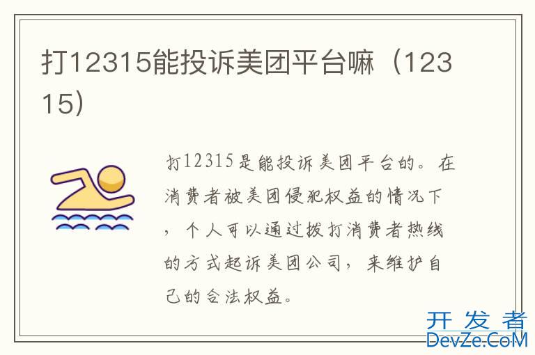 品牌型号:iPhone13 pro pro 系统:IOS15.5 软件版本:美团12.0.202打12315是能投诉美团平台的。在消费者被美团侵犯权益的情况下,个人可以通过拨打消费者热线的方式起诉美团