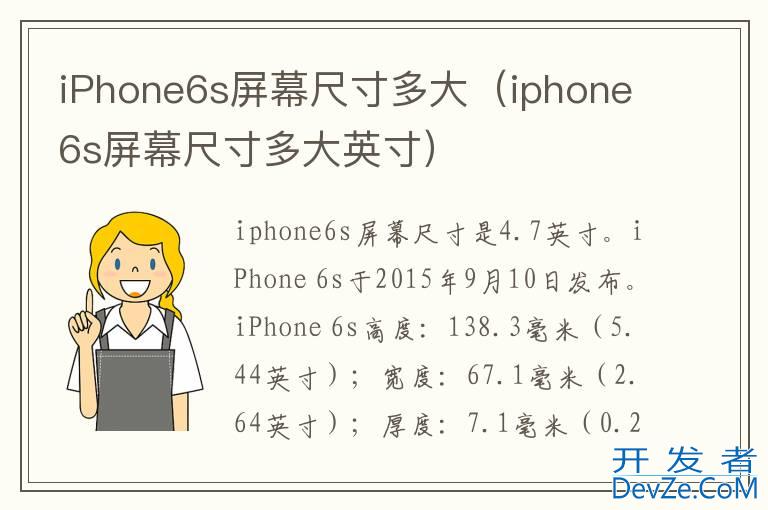 品牌型号:iPhone6s 系统:IOS15.4开发者_C百科 iPhone6s屏幕尺寸是4.7英寸。iPhone 6s于2015年9月10日发布。iPhone 6s高度:138.3毫米(5.4