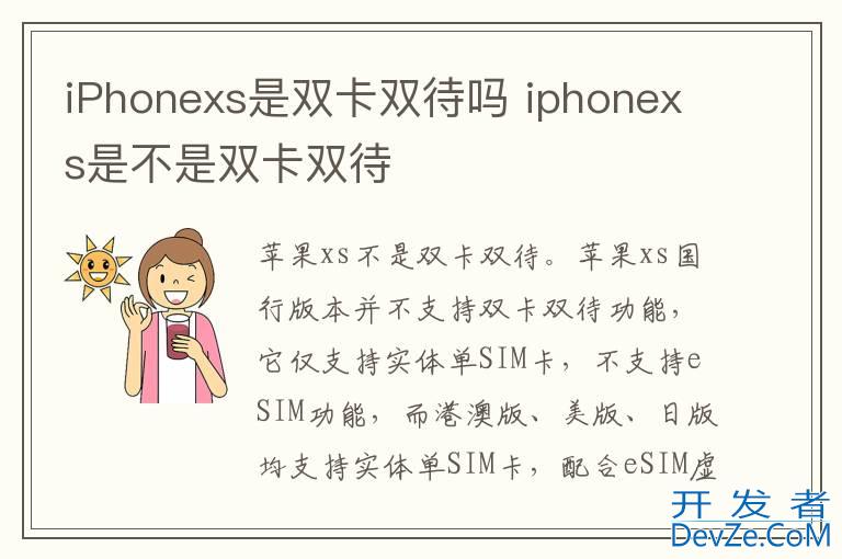 品牌型号:iPhonexs 系统:iOS 15.6.1iPhonexs不是双卡双待。iPhonexs国行版本并不支持双卡双待功能,它仅支持实体单SIM卡,不支持eSIM功能,而港澳版、美版、日版均支持