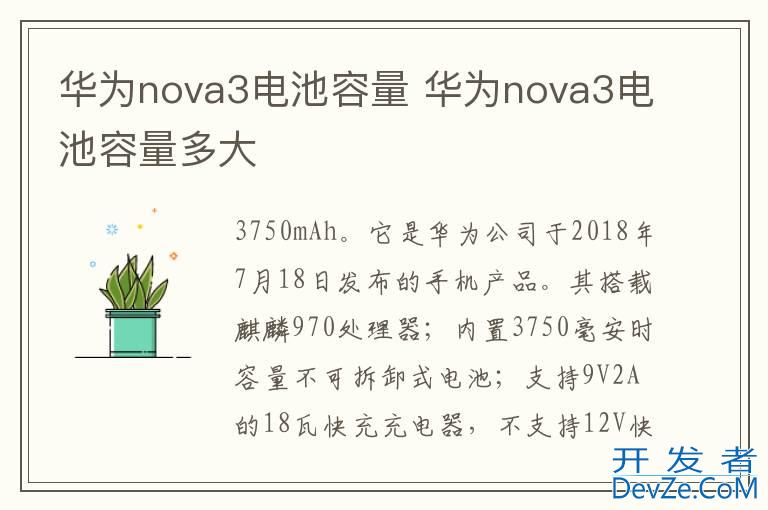 品牌型号:HUAWEI nova 3 系统:EMUI 8.2华为nova3的电池容量为3750mAh。它是华为公司于2018年7月18日发布的手机产品。其搭载麒麟970处理器;内置3750毫安时容量不