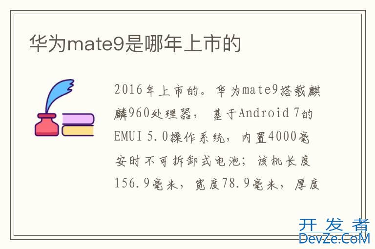 品牌型号:HUAWEI Mate 9 系统:EMUI 5.0华为mate9是2016年上市的。华为mate9搭载麒麟960处理器, 基于Android 7的EMUI 5.0操作系统,内置4000毫安时
