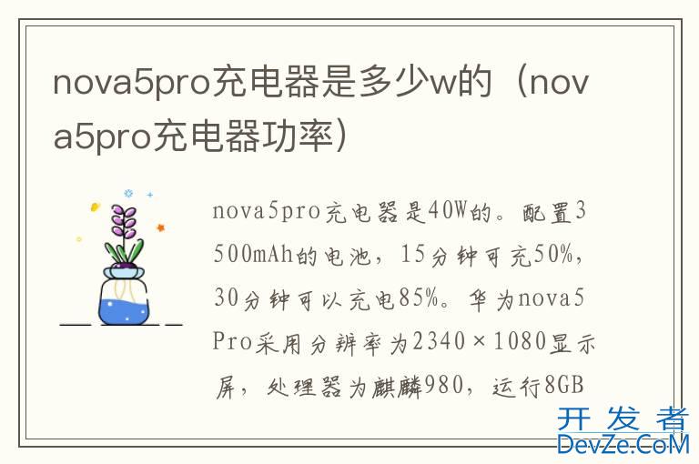 品牌型号:HUAWEI nova 5 Pro 系统:HarmonyOS 3nova5pro充电器是40W的。配置3500mAh的电池,15分钟可充50%,30分钟可以充电85%。华为nova5Pro采