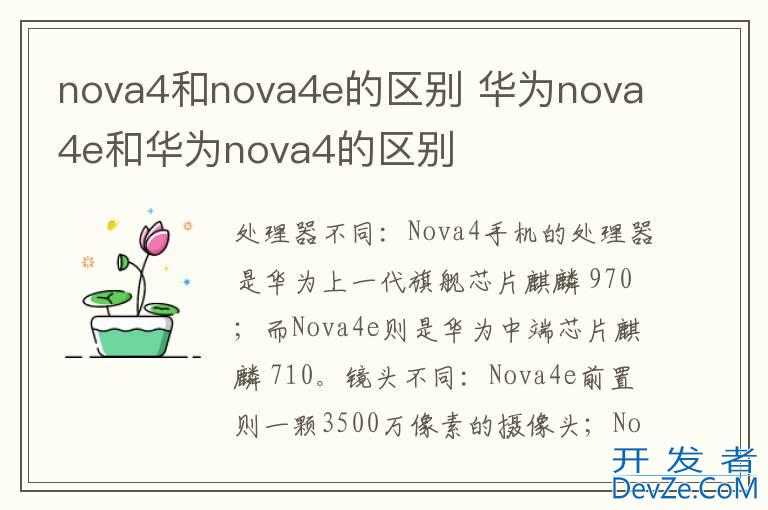 品牌型号:华为nova 4e 系统:EMUI 111、处理器不同:Nova4手机的处理器是华为上一代旗舰芯片麒麟 970;而Nova4e则是华为中端芯片麒麟 710。麒麟 970的GPU是Mali-G