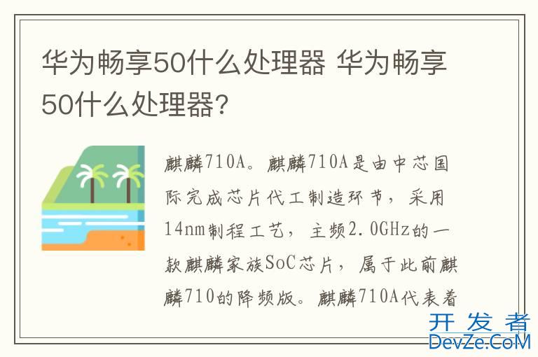 品牌型号:华为畅享50 系统:HarmonyOS华为畅享50的处理器是麒麟710A。麒麟710A是由中芯国际完成芯片代工制造环节,采用14nm制程工艺,主频2.0GHz的一款麒麟家族SoC芯片,属于此