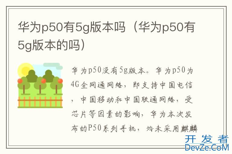 品牌型号:华为P50 系统:HarmonyOS 2华为p50没有5g版本。华为p50为4G全网通网络,即支持中国电信,中国移动和中国联通网络,受芯片等因素的影响,华为本次发布的P50系列手机,均未采用