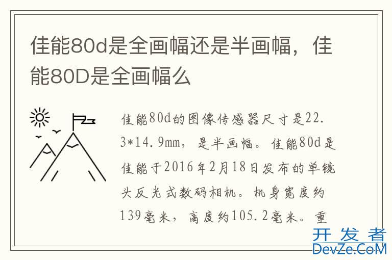 品牌型号:佳能单反照相机 系统:80d开发者_如何学运维 佳能80d的图像传感器尺寸是22.3*14.9mm,是半画幅。佳能80d是佳能于2016年2月18日发