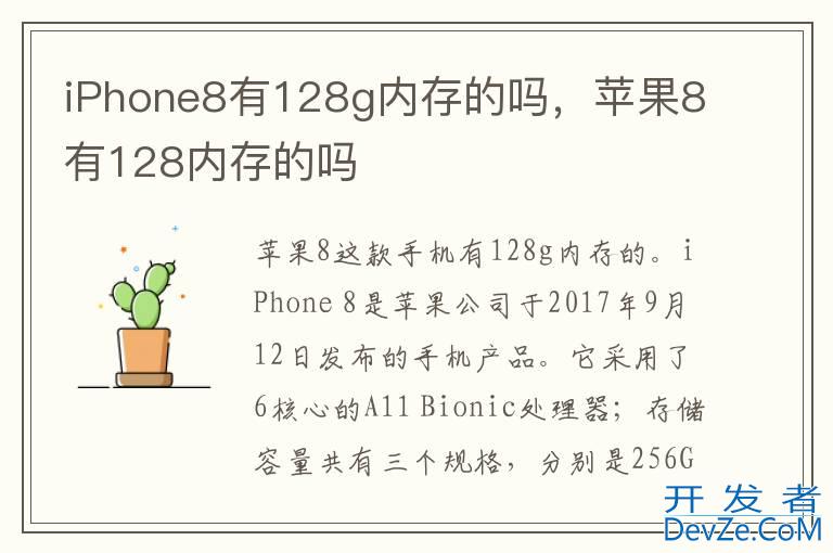 品牌型号:iPhone开发者_Go百科 8 系统:iOS 16.0iPhone8这款手机有128g内存的。iPhone 8是iPhone公司于2017年9月12日发布的手机产品。它采用了6核心的A11