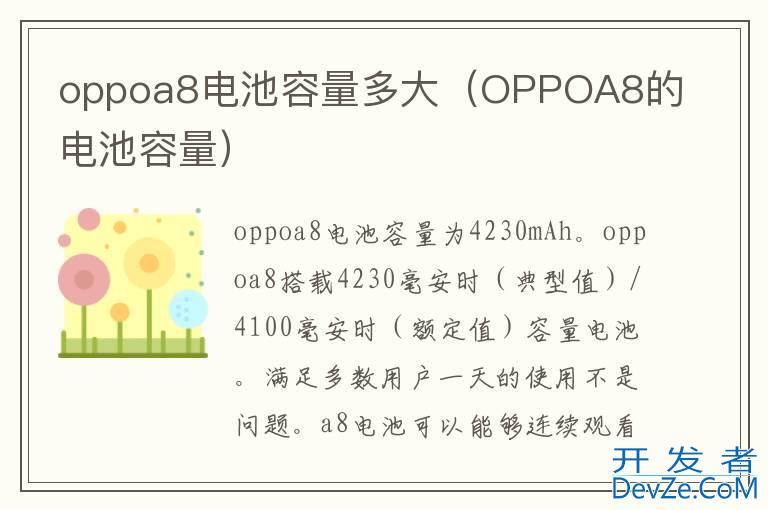 品牌型号:OPPO A8 系统:ColorOS 6.1.2开发者_运维百科 oppoa8电池容量为4230mAh。oppoa8搭载4230毫安时(典型值)/4100毫安时(额定值)容量电池。再配合Co