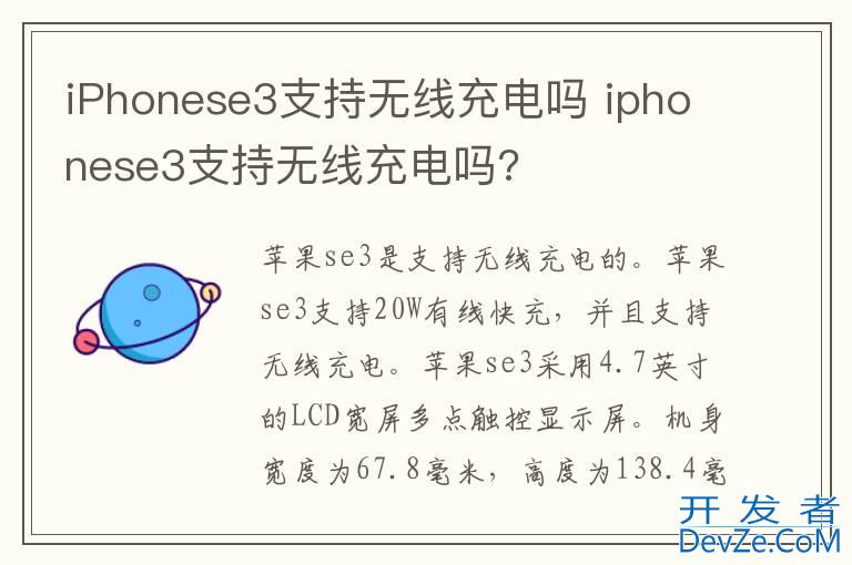 品牌型号:iPhonese3 系统:IOS15iPhonese3是支持无线充电的。iPhonese3支持20W有线快充,并且支持无线充电。iPhonese3采用4.7英寸的LCD宽屏多点触控显示屏,搭