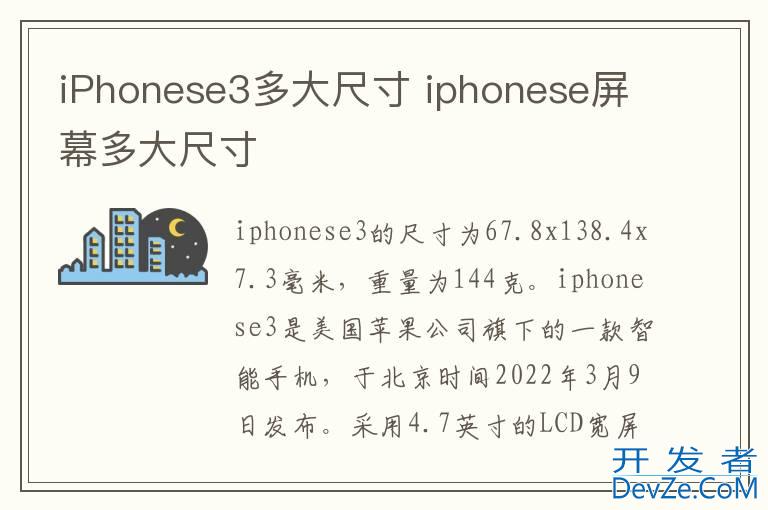 品牌型号:iPhonese3 系统:IOS15iPhonese3的尺寸为67.8x138.4x7.3毫米,重量为144克。iPhonese3是美国iPhone公司旗下的一款智能手机,于北京时间2022
