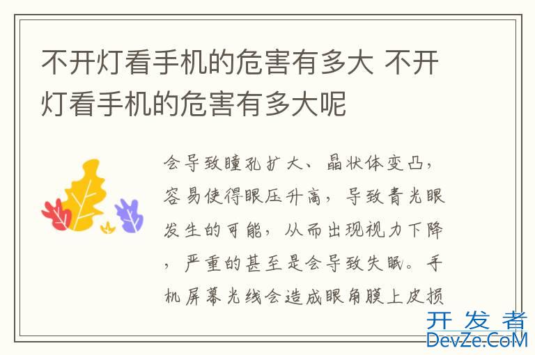 品牌型号:iPhone13 pro 系统:IOS15.4不开灯看手机会导致瞳孔扩大、晶状体变凸,容易使得眼压升高,导致青光眼发生的可能,从而出现视力下降,严重的甚至是会导致失眠。手机屏幕光线会造成眼角