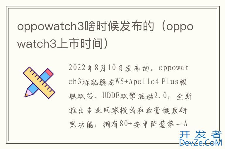 品牌型号:OPPO Watch 3 系统:ColorOS Watchoppowatch开发者_Go百科3是2022年8月10日发布的。oppowatch3标配骁龙W5+Apollo4 Plus旗舰双芯