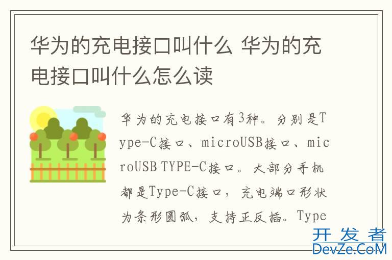 品牌型号:HUAWEI 原装线充 系统:CP405B/CP415B/CP415C/CP415D开发者_C百科 华为的充电接口有3种。分别是Type-C接口、microU