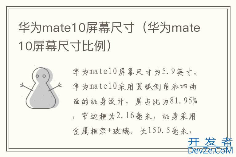 品牌型号:HUAWEI Mate 10 系统:EMUI 8.0华为mate10屏幕尺寸为5.9英寸。华为mate10采用圆弧倒角和四曲面的机身设计,屏占比为81.95%,窄边框为2.16毫米,机身采用