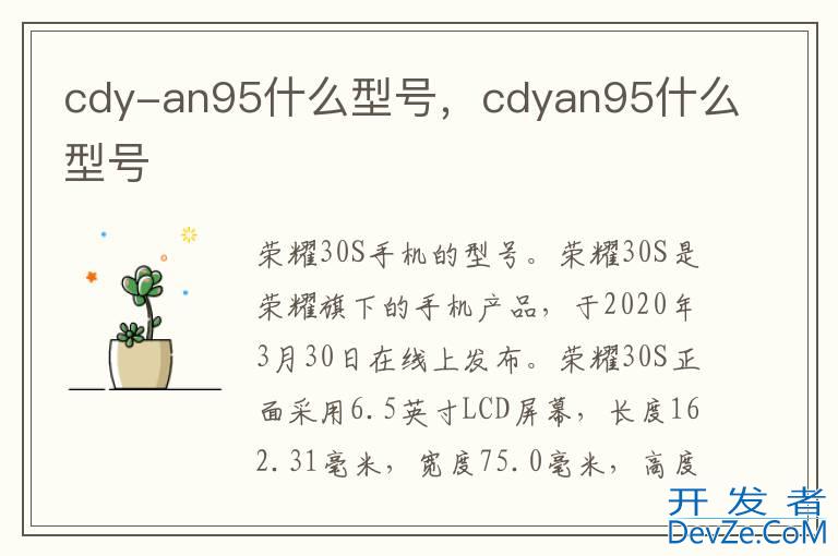 品牌型号:荣耀30S 系统:MagicUI3.1.1cdy-an95是荣耀30S手机的型号。荣耀30S是荣耀旗下的手机产品,于2020年3月30日在线上发布。荣耀30S正面采用6.5英寸LCD屏幕,长