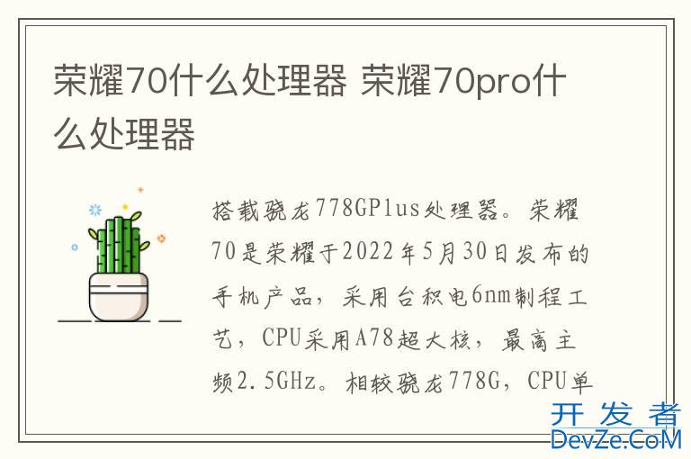 品牌型号:荣耀70 系统:Magic UI 6.1开发者_C百科 荣耀70搭载骁龙778GPlus处理器。荣耀70是荣耀于2022年5月30日发布的手机产品,采用台