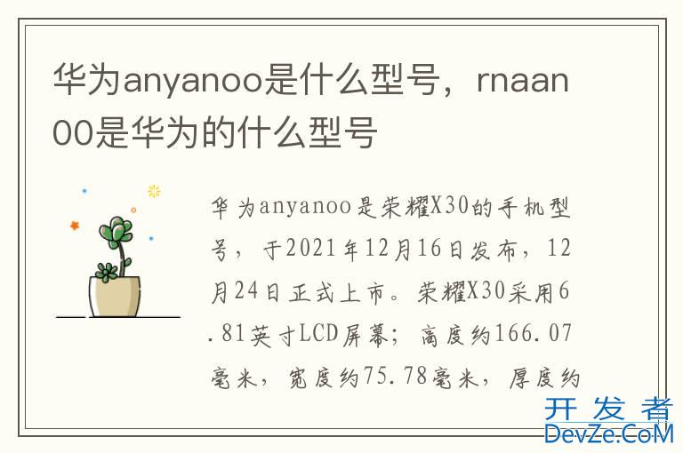 品牌型号:荣耀x30 系统:Magic UI 5.0华为anyanoo是荣耀X30的手机型号,于2021年12月16日发布,12月24日正式上市。荣耀X30采用6.81英寸LCD屏幕;高度约166.0