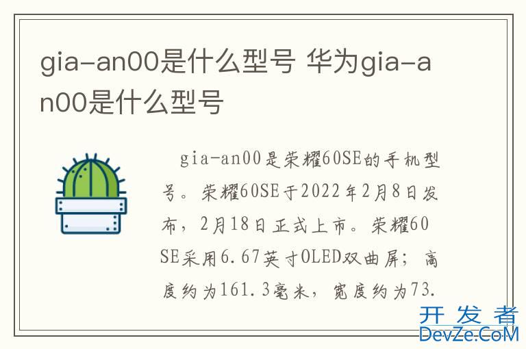 品牌型号:荣耀60SE 系统:Magic UI 6.0gia-an00是荣耀60SE的手机型号。荣耀60SE于2022年2月8日发布,2月18日正式上市。荣耀60 SE采用6.67英寸OLED双曲屏;