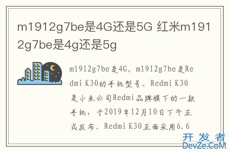 品牌型号:Redmi K30 系统:MIUI 13开发者_运维问答 m1912g7be是4G。m1912g7be是Redmi K30的手机型号。Redmi K30是小米公司Redmi品牌旗