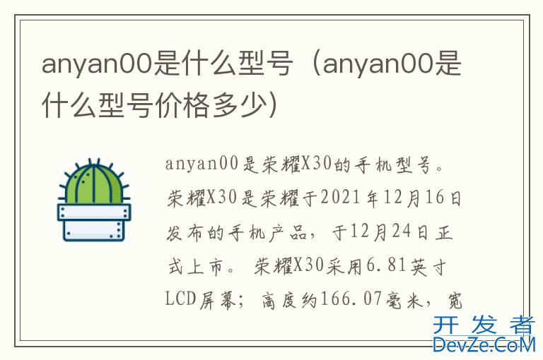 品牌型号:荣耀x30 系统:Magic UI 6.1anyan00是荣耀X30的手机型号。荣耀X30是荣耀于2021年12月16日发布的手机产品,于12月24日正式上市。 荣耀X30采用6.81英寸L