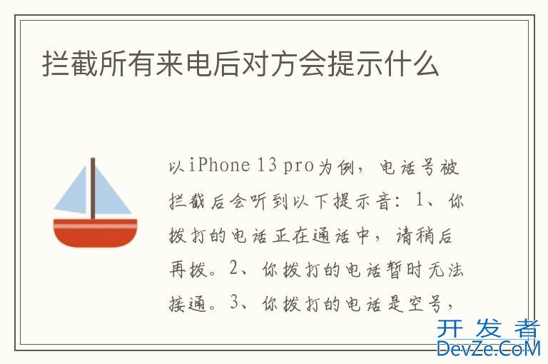 品牌型号:iPhone13 pro pro 系统:IOS15.4以iPhone13 pro pro为例,电话号被拦截后会听到以下提示音:1、你拨打的电话正在通话中,请稍后再拨。2、你拨打的电话暂时无法
