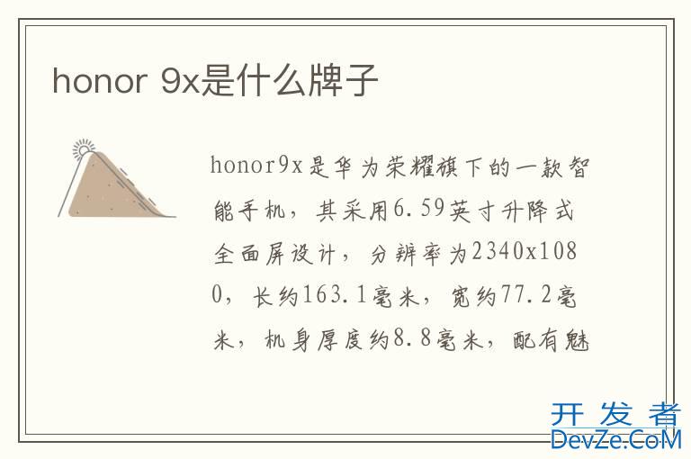 品牌型号:荣耀9X 系统:EMUI 9.1.1honor9x是华为荣耀旗下的一款智能手机,其采用6.59英寸升降式全面屏设计,分辨率为2340x1080,长约163.1毫米,宽约77.2毫米,机身厚度