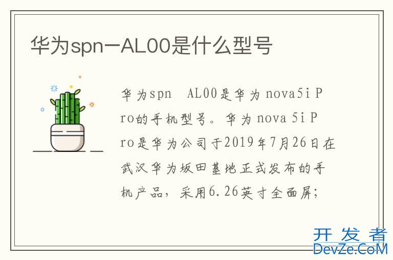 品牌型号:华为 nova5i Pro 系统:HarmonyOS 2华为spn−AL00是华为 nova5i Pro的手机型号。华为 nova 5i Pro是华为公司于2019年7月26日在武汉华为坂田