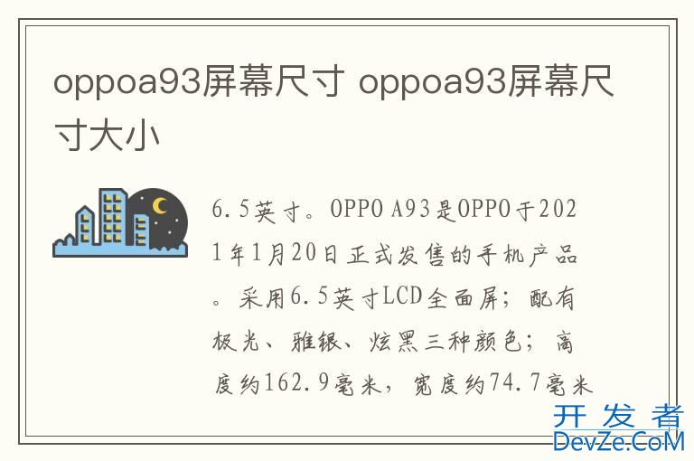 品牌型号:OPPO A93 系统:ColorOS 11.1oppoa93屏幕尺寸为6.5英寸。OPPO A93是OPPO于2021年1月20日正式发售的手机产品。采用6.5英寸LCD全面屏;配有极光、