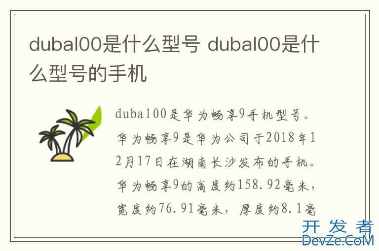 品牌型号:华为畅享 9S 系统:EMUI8.2开发者_运维问答 dubal00是华为畅享 9S手机型号。华为畅享 9S是华为公司于2018年12月17日在湖南长沙发布的手机。华为畅享 9