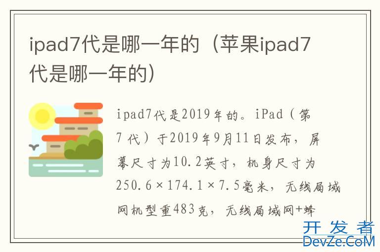 品牌型号:ipad7代 系统:iPad开发者_开发问答 airOS 15.4ipad7代是2019年的。iPad air(第 7 代)于2019年9月11日发布,屏幕尺寸为10.2英寸,机身尺寸为25
