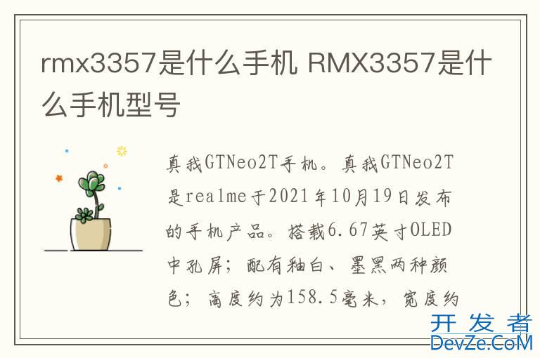 品牌型号:realme GT Neo2T 系统:realme UI2.0rmx3357是真我GTNeo2T手机。真我GTNeo2T是realme于2021年10月19日发布的手机产品。搭载6.67英寸
