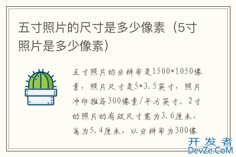 品牌型号:佳能相机 系统:EOS R6五寸照片的分辨率是1500*1050像素,照片尺寸是5*3.5英寸,照片冲印推荐300像素/开发者_C百科平方英寸。2寸的照片的有效尺寸宽为3.6厘米,高为5.4
