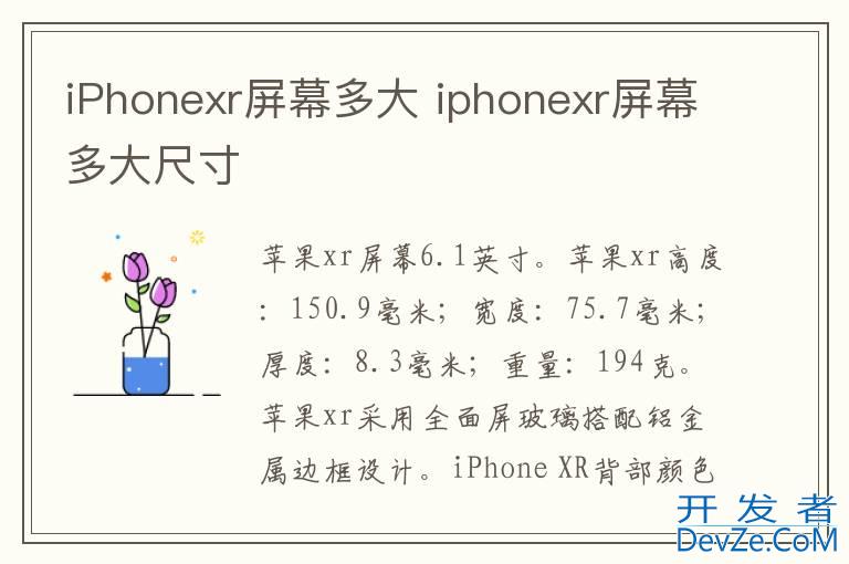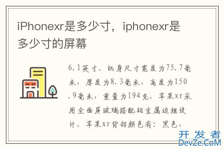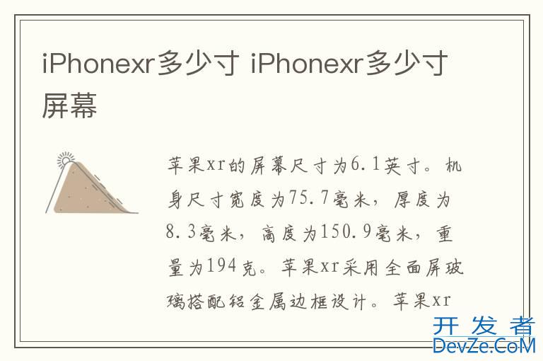品牌型号:iPhone XR 系统: iOS12iPhonexr的屏幕尺寸为6.1英寸。机身尺寸宽度为75.7毫米,厚度为8.3毫米,高度为150.9毫米,重量为194克。iPhonexr采用全面屏玻
