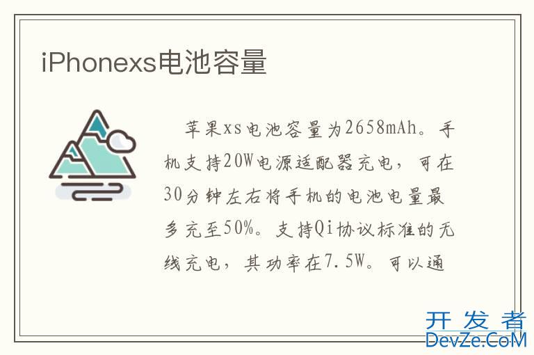 品牌型号:iPhone XS 系统:iOS 16.0iPhonexs电池容量为2658mAh。手机支持20W(功率)电源适配器充电,可在30分钟左右将手机的电池电量最多充至50%。支持Qi协议标准的无