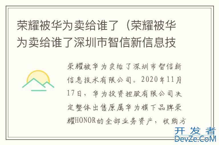 品牌型号:荣耀X30 系统:Magic UI 5.0荣耀被华为卖给了深圳市智信新信息技术有限公司。2020年11月17日,华为投资控股有限公司决定整体出售原属华为旗下品牌荣耀HONOR的全部业务资产,