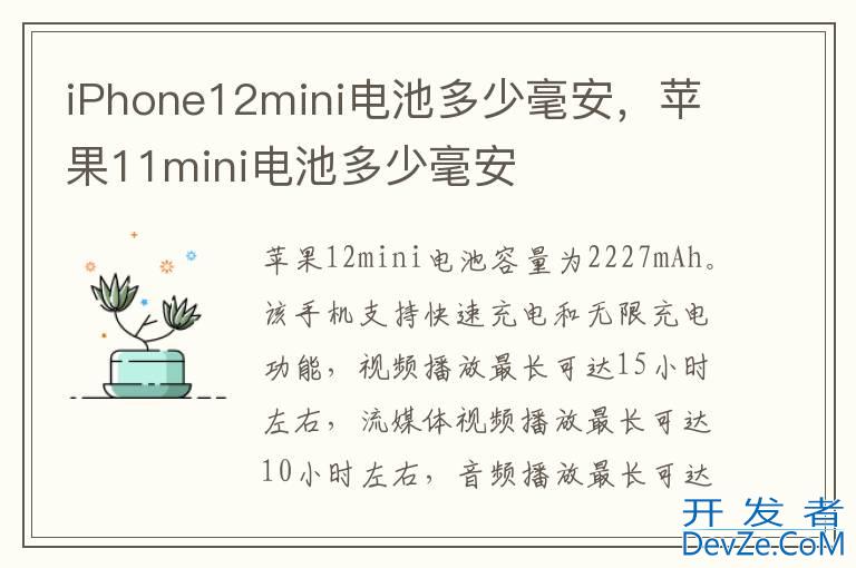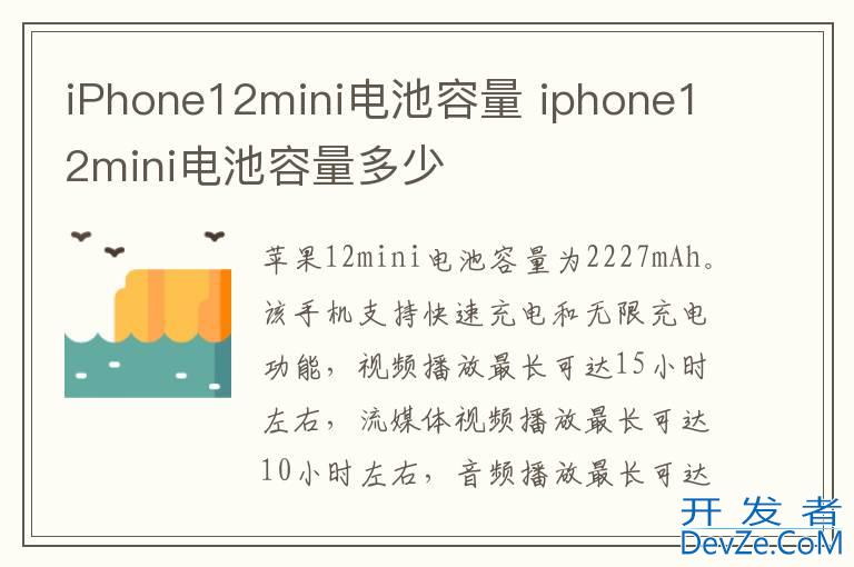 品牌型号:iPhone 12 pro mini 系统:IOS15.5iPhone12mini电池容量为2227mAh。该手机支持快速充电和无限充电功能,视频播放最长可达15小时左右,流媒体视频播放最长
