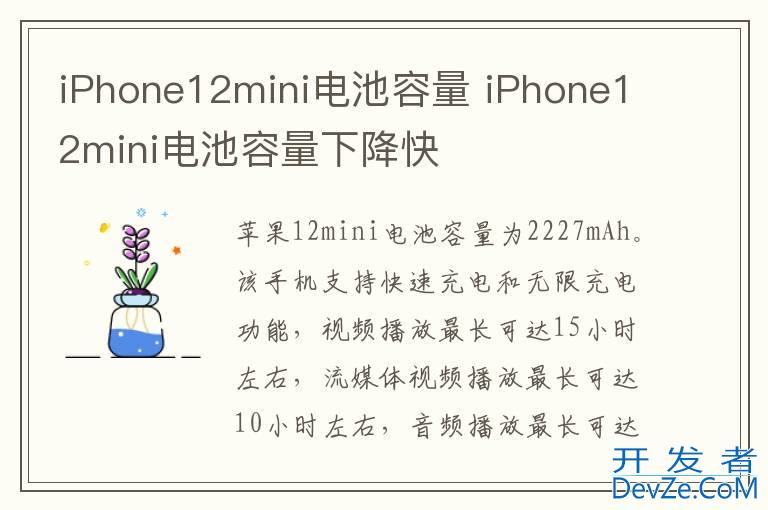 品牌型号:iPhone12mini 系统:IOS15.5iPhone12mini电池容量为2227mAh。该手机支持快速充电和无限充电功能,视频播放最长可达15小时左右,流媒体视频播放最长可达10小时