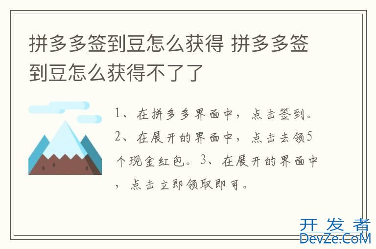 品牌型号:华为p50 系统:HarmonyOS2.0.0 软件版本:拼多多5.90.0拼多多获得签到豆需要在拼多多界面中,选择签到并完成任务即可开发者_C百科获得。以手机华为p50为例,拼多多获得签到