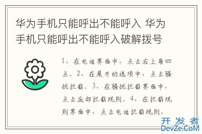 品牌型号:华为p50 系统:HarmonyOS2.0.0华为手机只能呼出不能呼入可能是因为手机开启了拦截所有来电导致,需要将拦截所有来电关闭即可。以手机华为p50为例,关闭拦截所有来电的步骤分为5步,