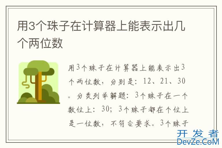 品牌型号:得力计算器开发者_运维问答 系统:1657A用3个珠子在计算器上能表示出3个两位数,分别是:12、21、30。分类列举解题:3个珠子在一个数位上:30;3个珠子都在个位上是一位数,不符合要求