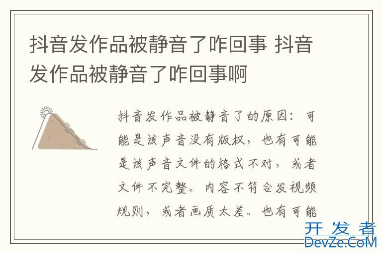 品牌型号:华为P50 系统:HarmonyOS3 软件版本:抖音20.1.0抖音发作品被静音了的原因:1、没有版权:抖音发作品被静音了,可能是该声音没有版权,没有版权的声音是无法使用的。用户需要换首歌