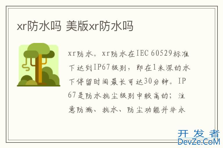 品牌型号:iPhone XR 系统:iOS 16.0开发者_开发技巧xr防水。xr防水在IEC 60529标准下达到IP67级别,即在1米深的水下停留时间最长可达30分钟。IP67是防水抗尘级别中较高