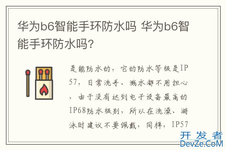 品牌型号:华为b6智能手环 系统:Android 4.4华为b6智能手环是能防水的,它的防水等级是IP57,日常洗手、溅水都不用担心,由于没有达到电子设备最高的IP68防水级别,所以在洗澡、游泳时建议