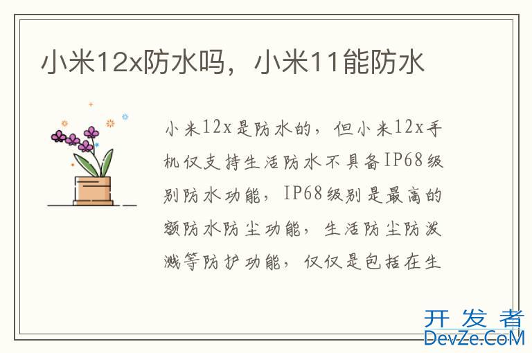 品牌型号:小开发者_C百科米12x 系统:MIUI 13小米12x是防水的,但小米12x手机仅支持生活防水不具备IP68级别防水功能,IP68级别是最高的额防水防尘功能,生活防尘防泼溅等防护功能,仅仅