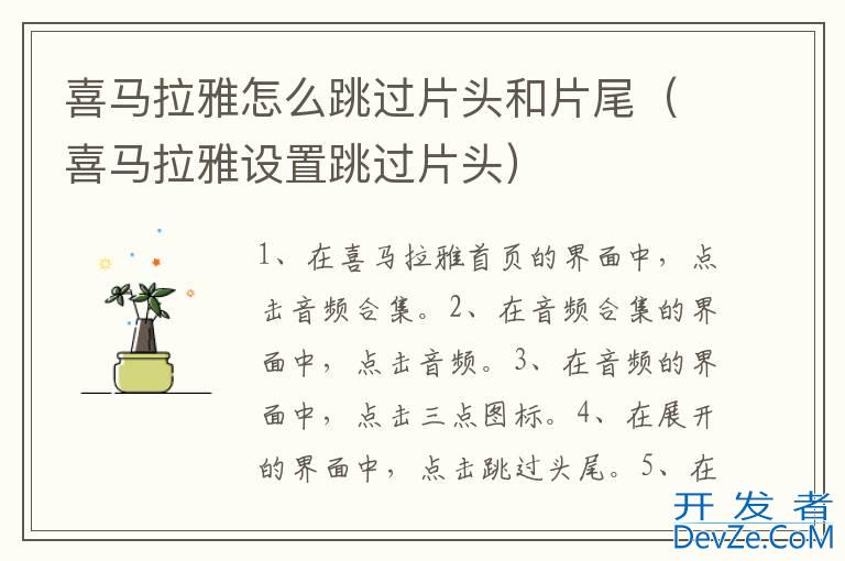 品牌型号:vivos9 系统:OriginOS1.0 软件版本:喜马拉雅9.0.9喜马拉雅跳过片头和片尾需要在音频界面中点击三点,选择跳过头尾即可。以vivos9手机为例,喜马拉雅跳过片头和片尾的步骤
