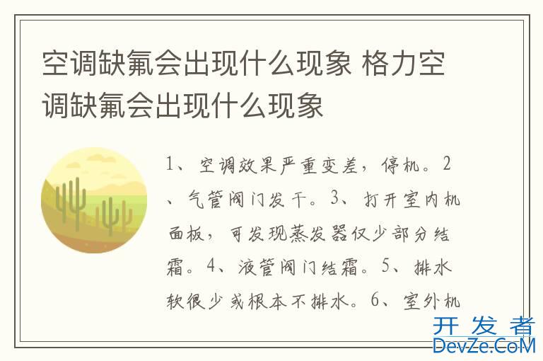 品牌型号:海尔空调 系统:KFR-35GW空调缺氟的现象:1、空调效果严重变差,甚至会出现频繁的保护性停机。从空调制冷系统运行关键状态参数变化上来说,当系统管路内冷媒量不足的时候,压缩机吸排气温度会偏