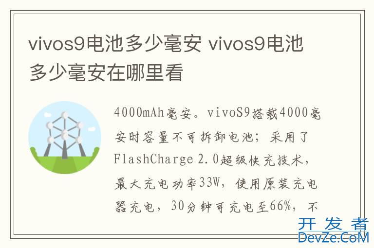 品牌型号:vivo S9 系统:OriginOSvivos9电池是4000mAh毫安。vivoS9搭载4000毫安时容量不可拆卸电池,支持33瓦有线充电;采用了FlashCharge 2.0超级快充技