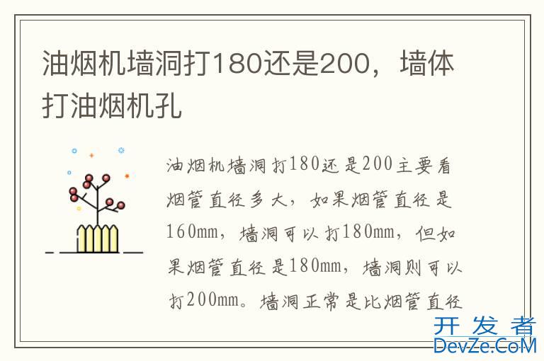 品牌型号:方太油烟机 系统:JCD9A开发者_JAVA技巧 油烟机墙洞打180还是200主要看烟管直径多大,如果烟管直径是160mm,墙洞可以打180mm,但如果烟管