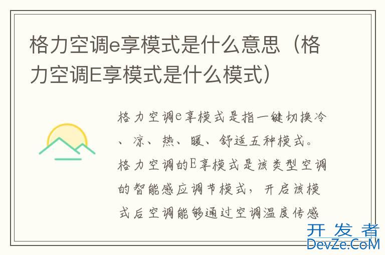 品牌型号:格力空调 系统:KFR-35GW格力空调e享模式是指一键切换冷、凉、热、暖、舒适五种模式。格力空调的E享模式是该类型空调的智能感应调节模式,开启该模式后空调能够通过空调温度传感器对室内温度、