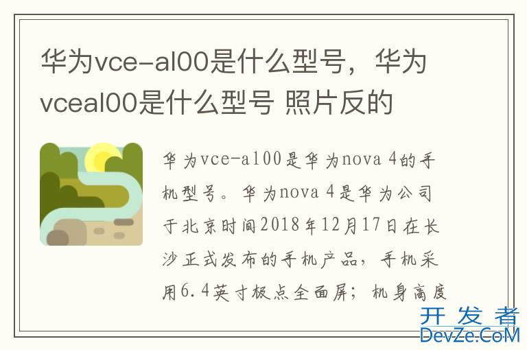 品牌型号:华为nova 4 系统:EMUI 9.0华为vce-al00是华为nova 4的手机型号。华为nova 4是华为公司于北京时间2018年12月17日在长沙正式发布的手机产品,手机采用6.4英